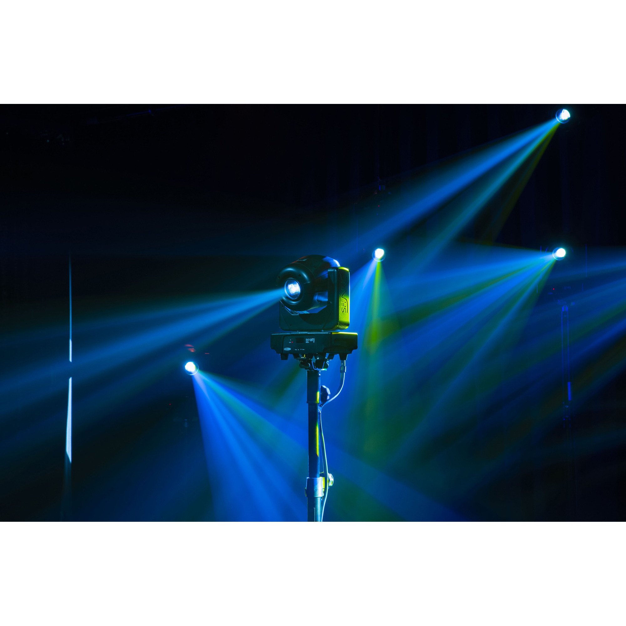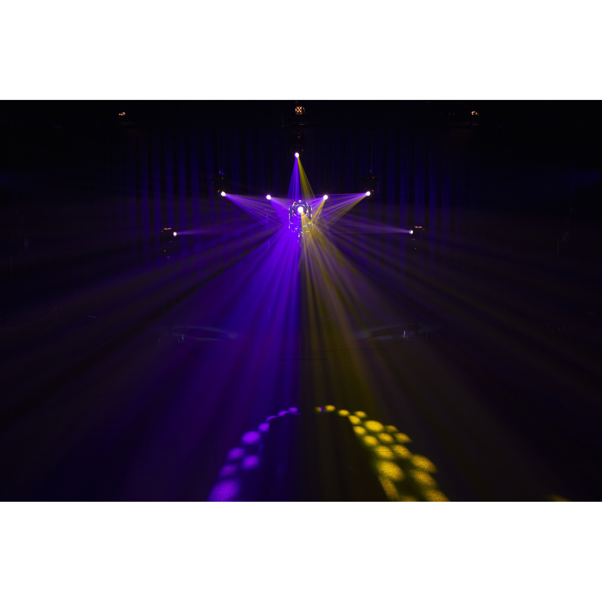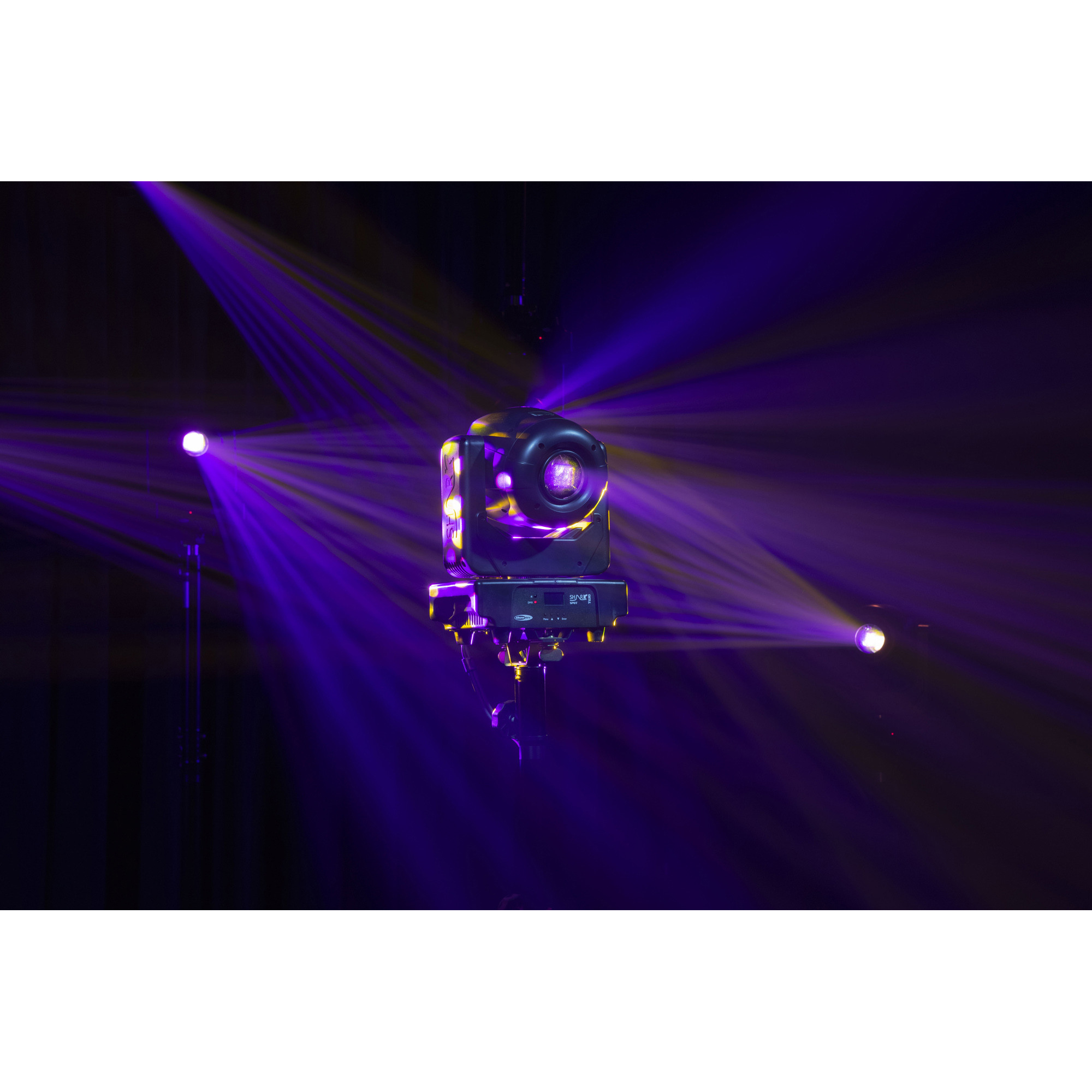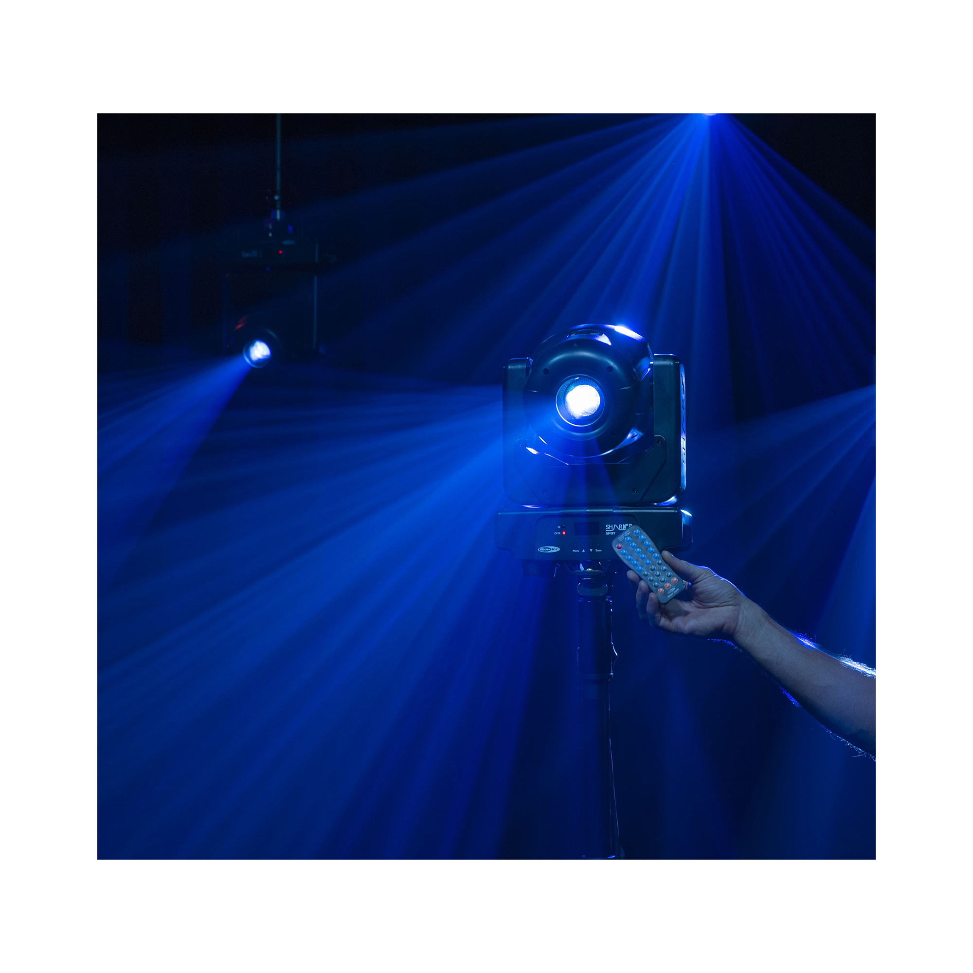 Der Showtec Shark Spot Two ist ein LED-Moving-Head mit einer Leistung von 90 Watt für die Verwendung im Innenbereich. Er ist 50 Prozent leistungsstärker als der Shark Spot One und verfügt über sieben dichroitische Farben plus offen und ein dreifaches Prisma. Damit hat er alles, was es für eine farbenfrohe und dynamische Lichtshow braucht. Mit seinen sechs Gobos können Sie beeindruckende Effekte erstellen, während der motorisierte Fokus dafür sorgt, dass alles messerscharf dargestellt wird. Selbstverständlich verfügt er auch über eine Dimmer- und eine Stroboskopfunktion. Der Shark Spot Two kann im DMX-, Auto- oder musikgetakteten Modus laufen, als Master- oder Slavegerät dienen und mit der mitgelieferten Fernbedienung gesteuert werden. Sie können die Einstellungen direkt über das integrierte OLED-Display ändern.